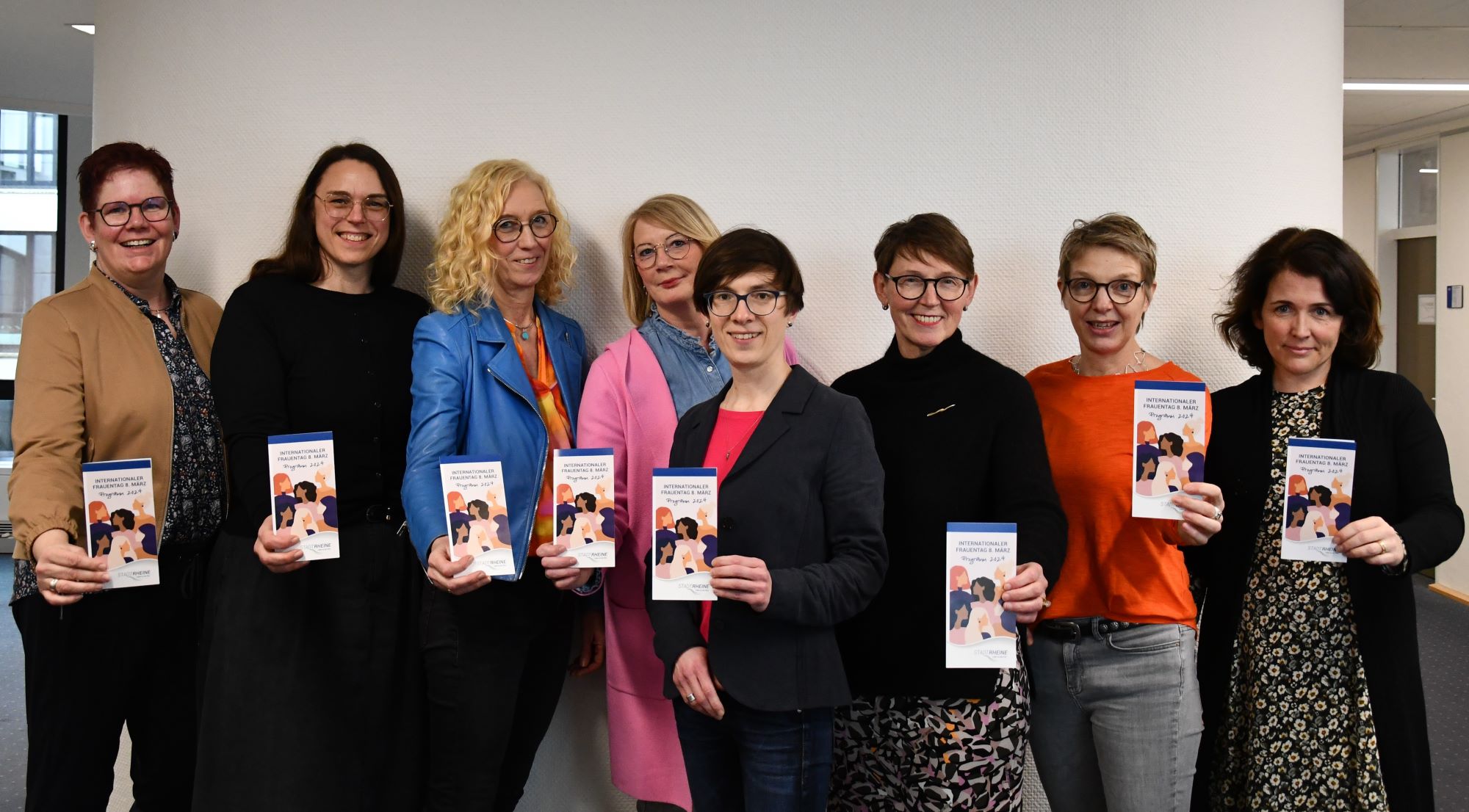 Zusammen mit der Gleichstellungsbeauftragten, Gaby Beckmann, präsentieren die Kooperationspartnerinnen den Flyer, dem alle Informationen rund um die Veranstaltungen entnommen werden kann. Er liegt in den teilnehmenden Institutionen, der Stadtverwaltung Rheine sowie an verschiedenen Stellen innerhalb der Innenstadt aus.