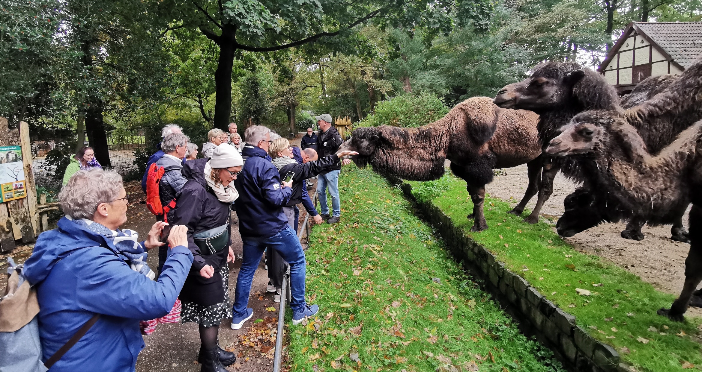 Nach Kaffee und Kuchen im Gertrudenstift machte sich die Gruppe auf in den Naturzoo. Dort empfing Zooinspektor Michael Rolfs die Besucherinnen und Besucher. Der Experte erläuterte ebenso informativ wie unterhaltsam die Zielrichtung des Rheiner Naturzoos. So sei der Rheiner Naturzoo einer der ersten seit den 80er Jahren gewesen, der sich der Nachzucht der Dscheladas gewidmet habe. 500 Tiere in den Zoos weltweit würden von Rheine aus bei Themen wie Nachzucht, Austausch von Tieren etc. gemanaged.