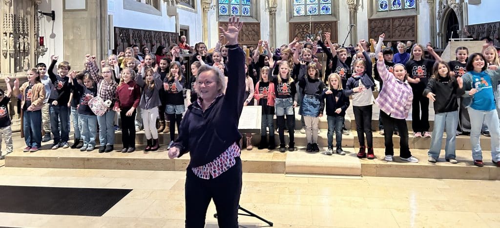 Bombastisch war die Reaktion im Publikum auf den Auftritt der Jekits-Kinderchöre der Bodelschwingh- und Südeschschule. Sie sorgten mit ihrer unbekümmerte Art für helle Begeisterung. Leiterin Ulla Vossenberg stimmte mit den Kinder das Sternenlied, das Wutlied und die Traumfänger an. Unterstützt wurden sie von Peter Kieser, der die Kinder am Piano auf Hochtouren brachte.