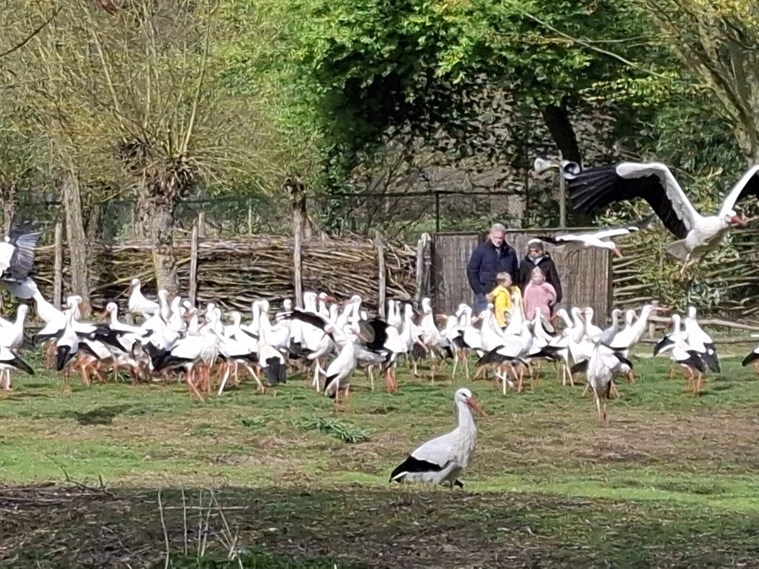 Wenn nachmittags im Naturzoo die Störche gefüttert werden, kommen nicht nur Tiere aus dem Zoo pünktlich um 15.30 Uhr zusammen, sondern auch viele Störche aus dem gesamten Umland so dass sich ein imposantes Bild ergibt.