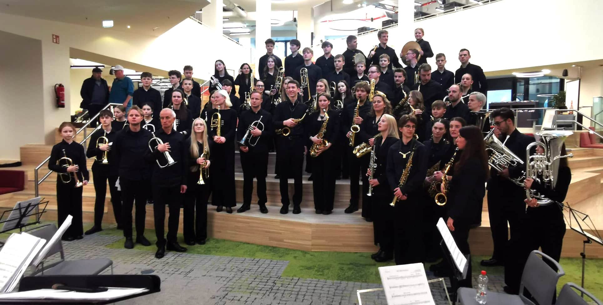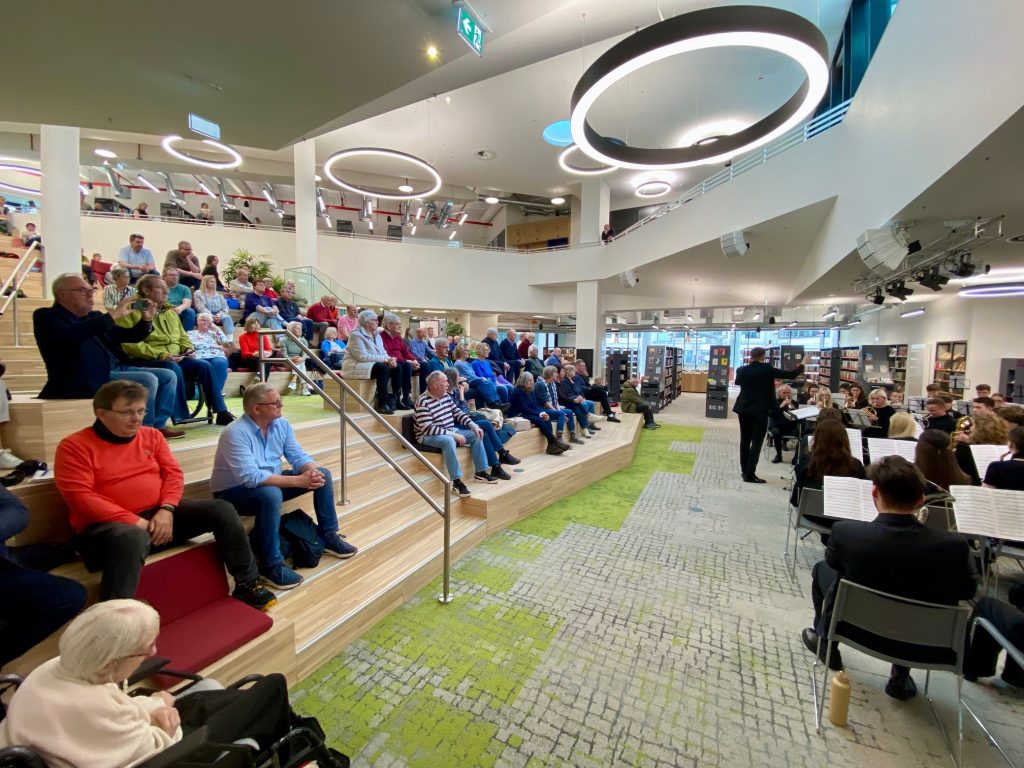 RHEINE. Es war ein Konzert der Extra-Klasse, das am Donnerstag nachmittag für ungewöhnlich viel Betrieb in der Stadtbibliothek sorgte. Das außergewöhnliche Niveau der jungen Künsterlinnen und Künstler bemerkten die vielen Zuschauer schon nach den ersten Tönen. Das Fanfare-Orchestra der Jugendmusikschule Trakai hatte sich am Mittwoch über die Ostsee auf den Weg gemacht zur  “Open Dutch Brass Band-Championship, die am Wochenende in Drachten stattfindet. In der Partnerstadt Rheine hatte man anfragt, ob hier eine Zwischenübernachtung für die 60-köpfige Gruppe organisiert werden könnte. “Kein Problem” – signalisierten Jan-Christoph Tonigs von der Stadtkultur Rheine und der Städtepartnerschaftsverein. Im Gegenzug bot das Orchester ein knapp einstündiges Gastspiel an. Und so kam auch der Publikumsbereich in der neuen Stadtbibliothek zu seiner ersten größeren Bewährungsprobe als Veranstaltungsarena.