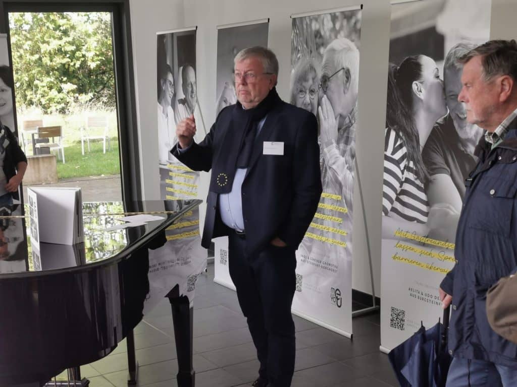 Bernd Weber, vicevoorzitter van de Europa-Unie, presenteerde het “me&you” project aan de deelnemers in het Kubushaus. Hij legde uit wat de doelstellingen zijn van de Europa-Unie, die Europa dichter bij de mensen wil brengen. Gezien de huidige ontwikkelingen hebben we meer dan ooit behoefte aan cohesie in Europa, zei Weber. Centraal in de tentoonstelling staan de uitspraken van echtparen uit verschillende Europese landen, waarbij één partner uit het district Steinfurt komt. Vooral uitspraken over vrijheid van verkeer en vrede domineren. “Iedereen kan zich geïnspireerd voelen door de uitspraken van deze mensen,” vat Weber samen.